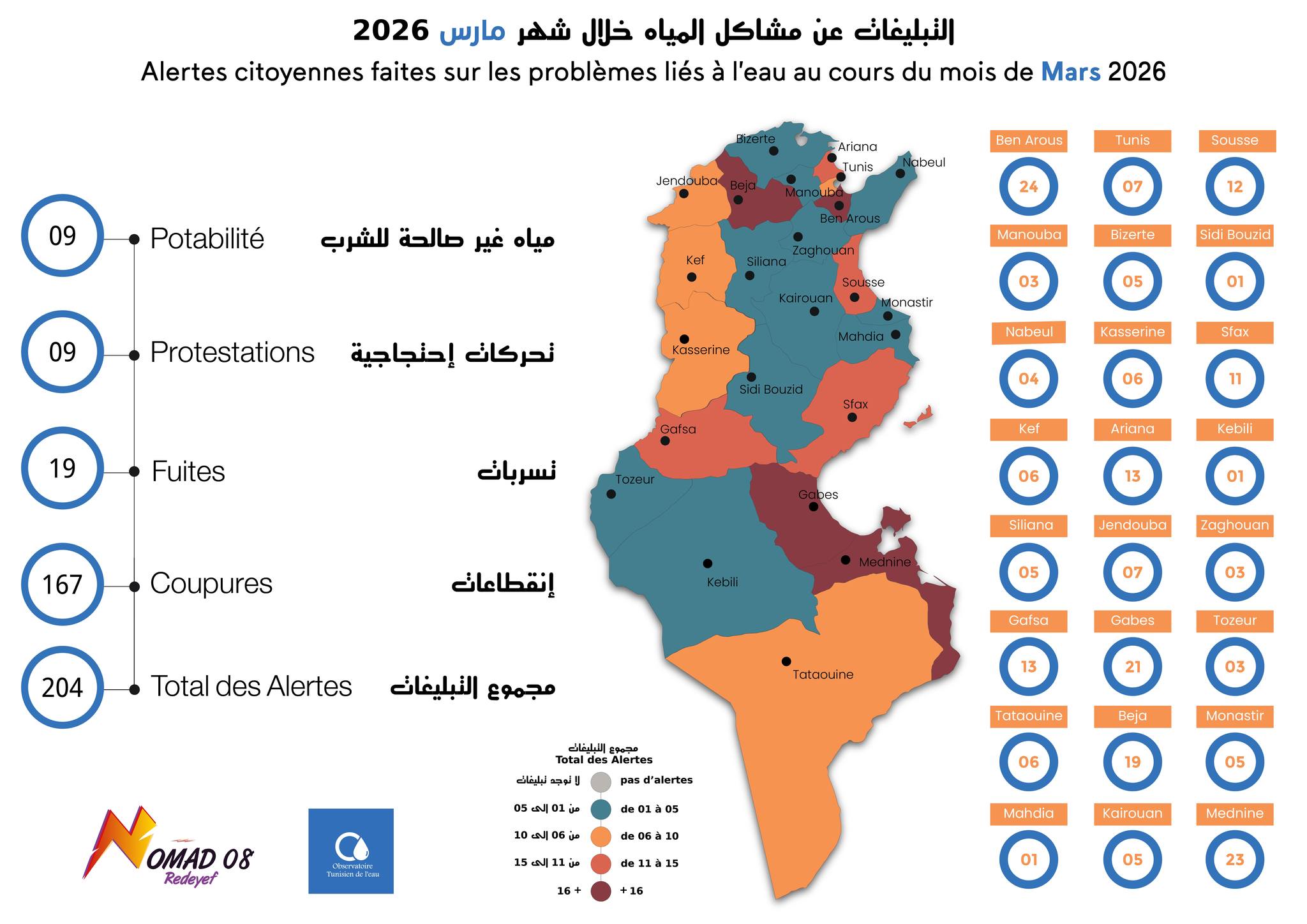 سجّل المرصد التونسي للمياه خلال شهر مارس 2026، ما مجموعه 167 إنقطاعاً وإضطراباً في توزيع المياه الصالحة للشرب بكامل ولايات، في مؤشر متواصل على تفاقم أزمة التزوّد بالمياه في عدد من الجهات.